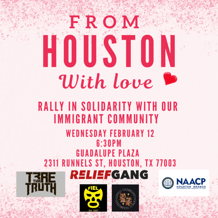 [HOUSTON, TX] On Wednesday February 12 2025 at 6:30pm at Guadalupe Plaza (2311 Runnels St. Houston TX 77003) FIEL Houston, Trae Tha Truth and community members will gather to stand in solidarity with the immigrant community.